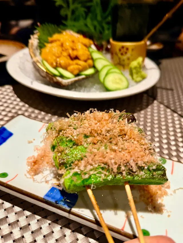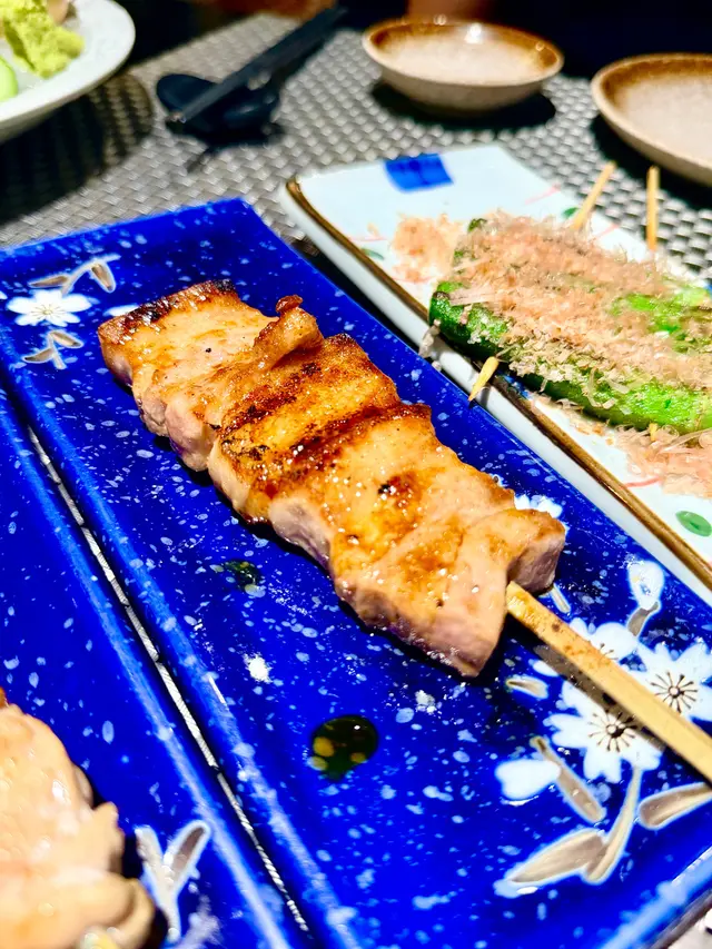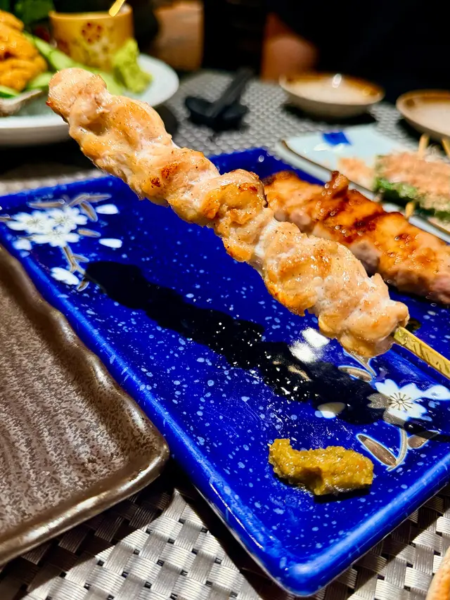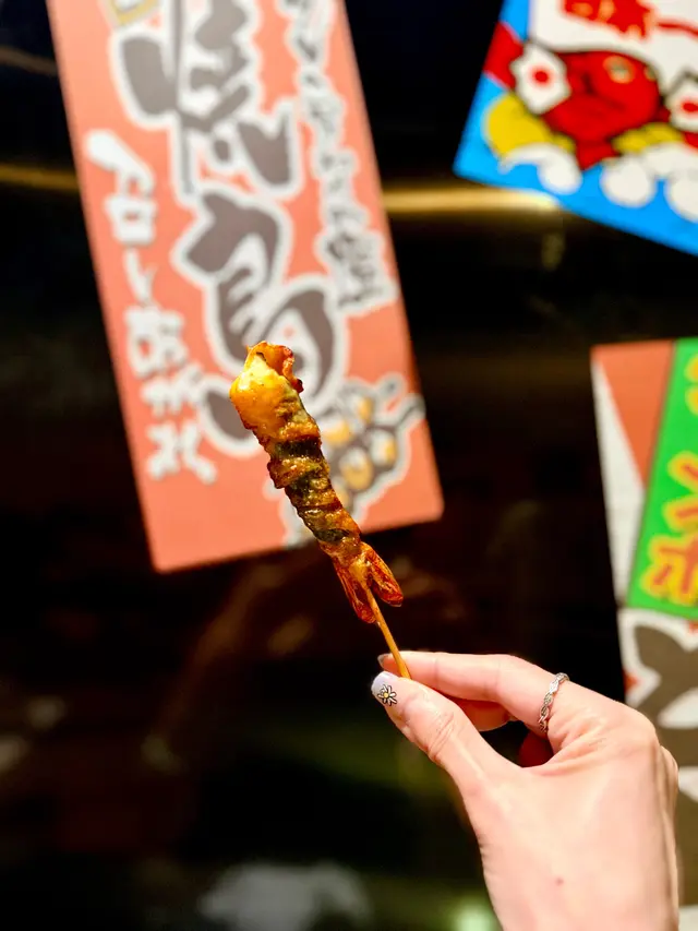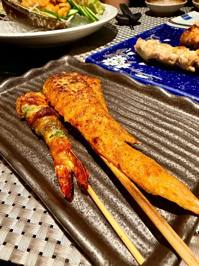 紫蘇葉雞皮蝦串:雞皮香脆配蝦鮮甜,紫蘇葉添上香氣。