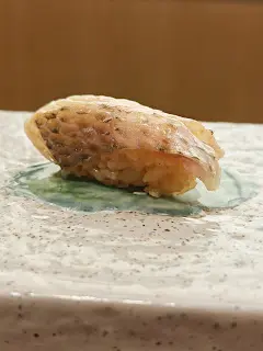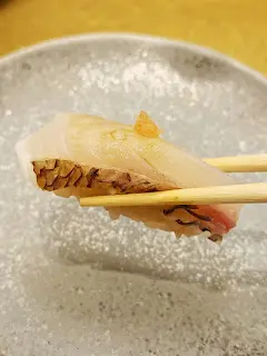 招牌菜,在吞拿魚赤身壽司上、刨下大量紅酒煮鵝肝,吃法很有新鮮感,鵝肝以紅酒浸醃過已減膩感,再刨成碎粒,輕盈得多,肥美感卻保持,溶化在吞拿魚壽司上,食味大大提升。