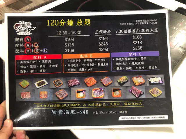 120分鐘嘅任食放題,分為A/B/C配料,晚市最平$168(7:30前離座/9:30後入座,未加一)就有交易!想食哂配料A+B+C,都只係$298/位,仲有其他火鍋配料,飲品,豆腐花,雪糕,甜品等,性價比都吾錯,絕對值回票價呢~