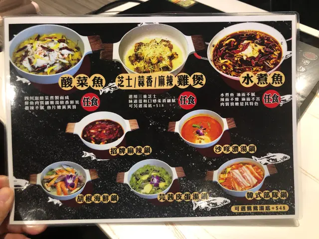 旺角百寶利商業中心又有新開任食火鍋店開幕🥳 除麻辣,沙嗲,胡椒海鮮,莞茜皮蛋,韓式部隊五大特色湯底外,更供應埋酸菜魚,芝士/蒜香/麻辣雞煲,水煮魚鍋添!想直接打邊爐又得,歎完酸菜魚,水煮魚,雞煲後再打邊爐都得,重點係任食架🥳