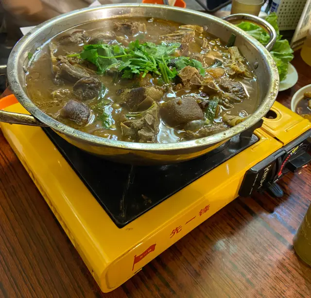 竟然羊腩多過其他材料, 佢送埋碟生菜。我地坐係出面,對住個熱住既羊腩煲真係另有一番風味!