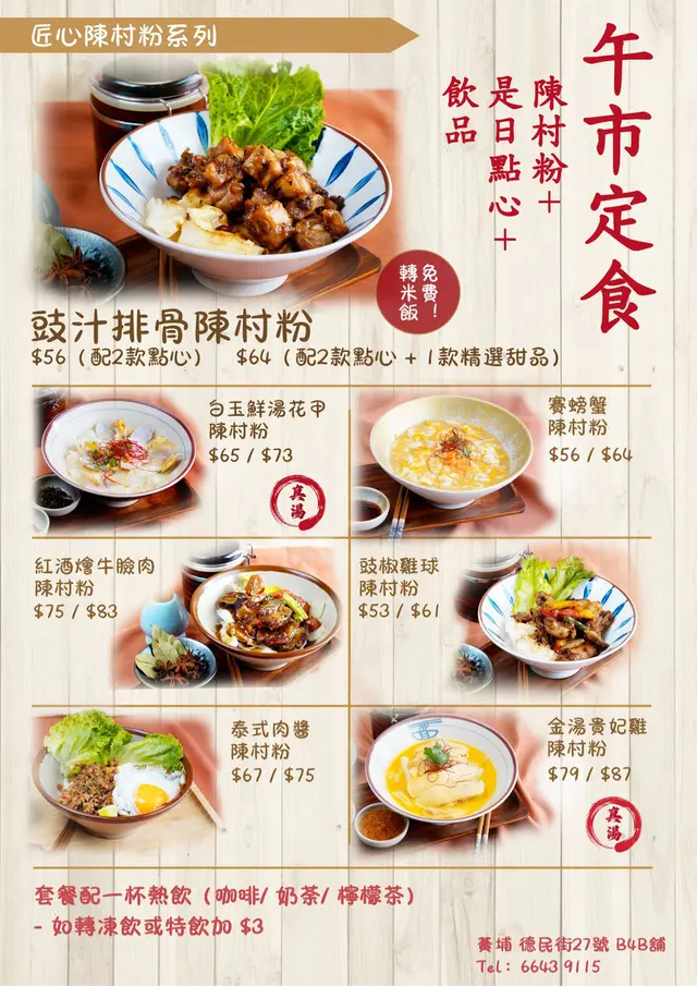 呢間店主打個陳村粉,午市有套餐定食優惠,配兩款點心同甜品再加杯飲品