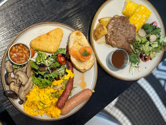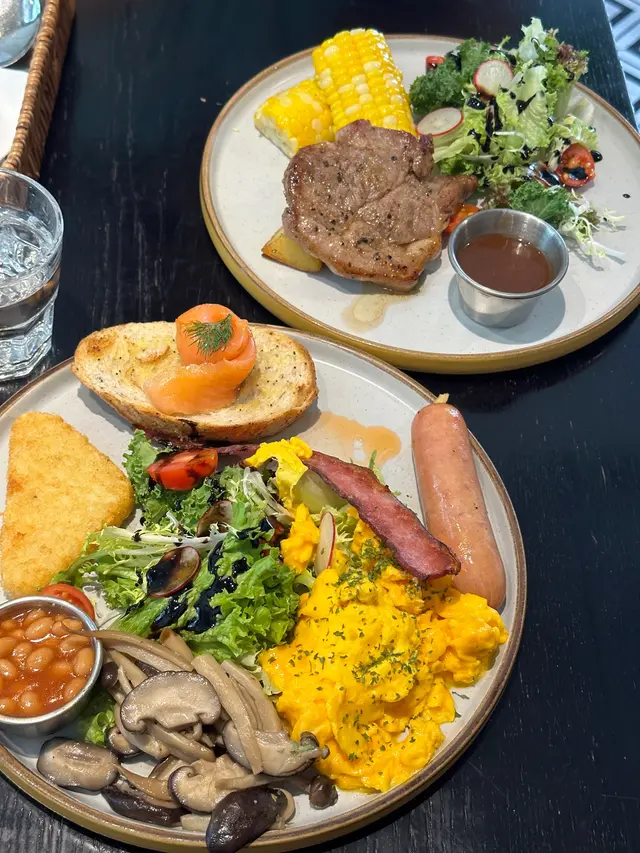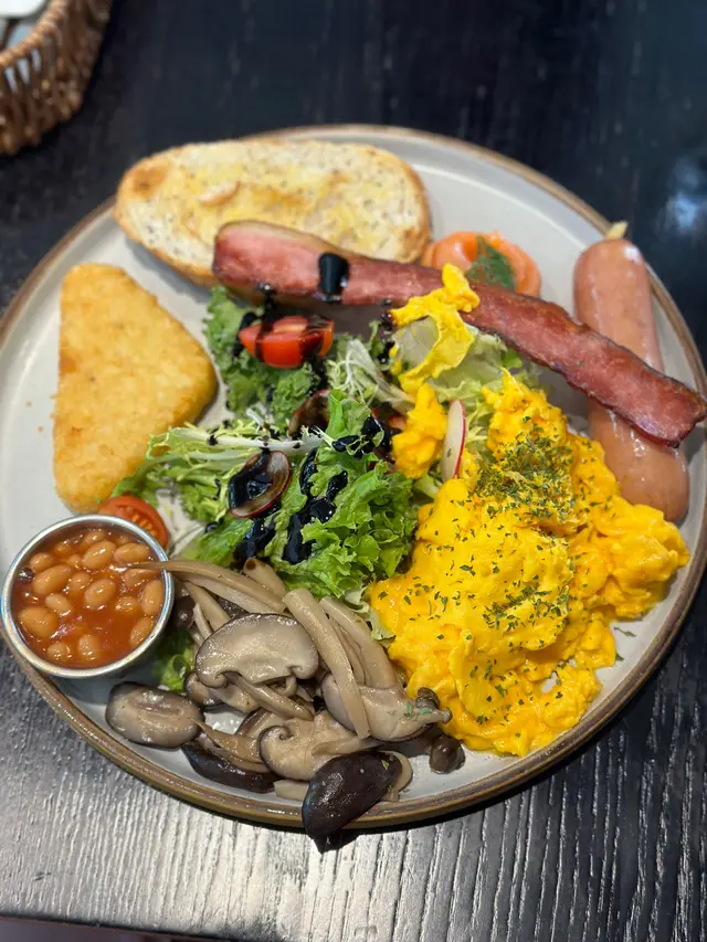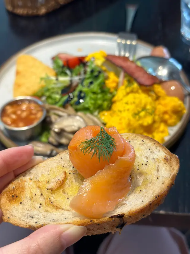 All day breakfast 最緊要望落色彩繽紛,食物款式夠豐富。雜菌係我最愛的菜式,比得夠多。薯餅細細件,炸得香脆。炒蛋配多士係最夾。三文魚新鮮。腸仔juicy。煙肉乾好條薯片,卜卜脆。仲有開胃茄汁豆。中間嘅沙律🥗清新balance番其他炸物~