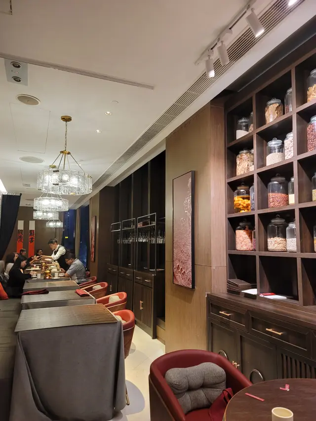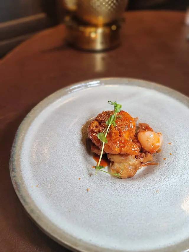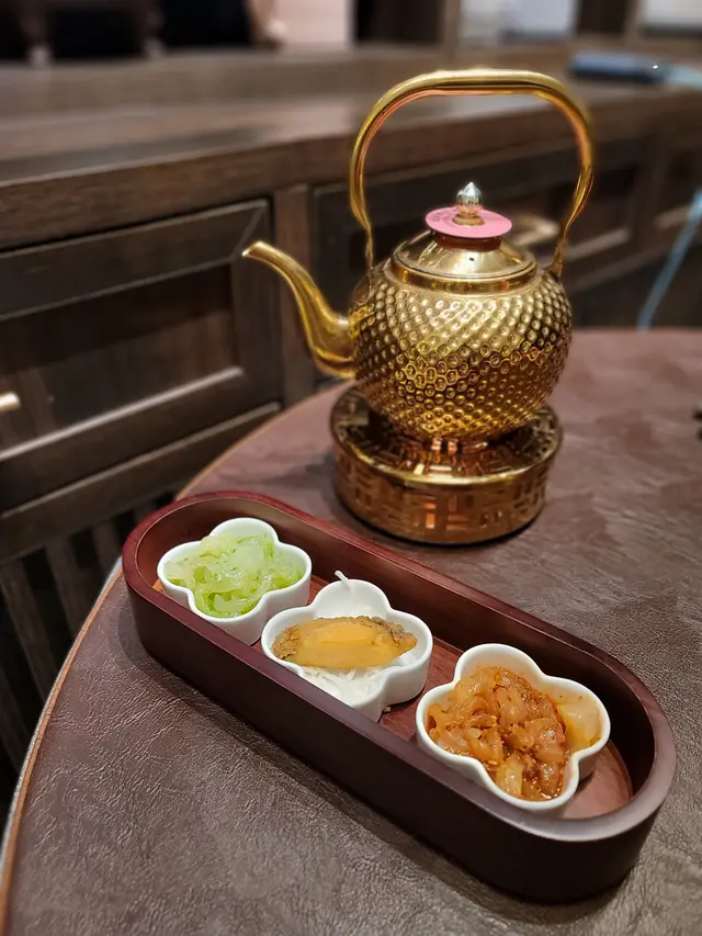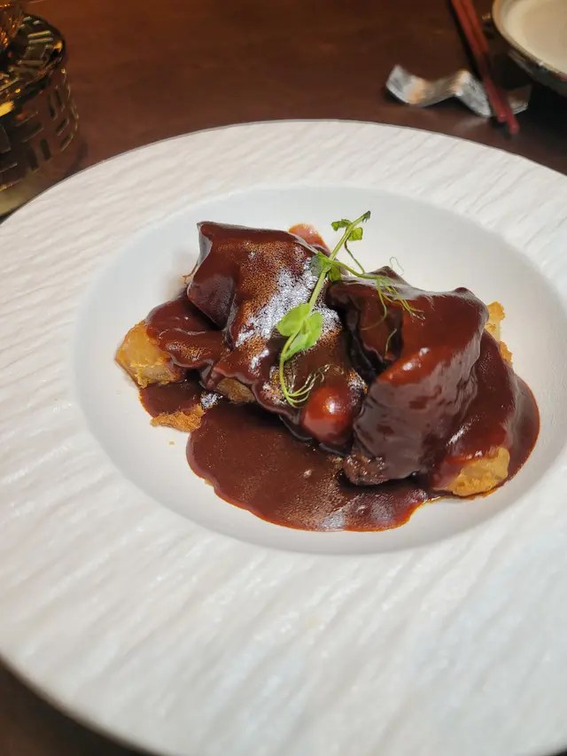 頭盤部分的椒鹽糖心鮑魚令人眼前一亮,傳統鮑魚料理加入椒鹽調味,很創新。鮑魚外層炸至香脆,內裡依然保持嫩滑質感。搭配的鴛鴦海蜇絲,一邊是清新爽口的原味,配以翠綠醬汁,口感清雅;另一邊則是微辣的川椒調味,層次豐富。