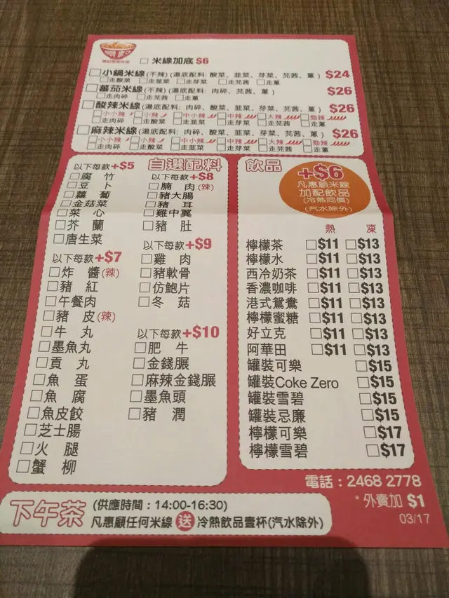 另類車仔麵 meisee等级32017-06-16125 浏览 关注 雲南米線在香港好盛行,是否正宗就無從考究喇! 一般有幾款湯底可供選擇, 有小鍋米線; 蕃茄米線; 酸辣米線及麻辣米線四種, 當中以酸辣米線及麻辣米線可以選擇辣味程度。 小鍋及蕃茄是不帶辣味。它們四款湯底內附有酸菜﹑韭菜﹑ 芽菜,芫茜﹑蔥﹑肉碎。 視乎選擇湯底, 人客可以在落單時,揀選不要配菜。 自選配料亦有不同價錢, 素菜類每款5元, 丸類7元每款, 要手工煮餸如腩肉; 雞翼; 豬軟骨; 肥牛等。 分別每款8至10不等。 更可食米線只要加6元配飲品, 冷熱同價。湯底稍為鹹了點。$40以上食记乃用户个人意见 , 并不代表OpenRice之观点。赞好分享另類車仔麵 景村雲南米線 https://s.openrice.com/QrLT0aTGg00检举 张贴 评分3味道4环境3服务4卫生4抵食用餐途径堂食