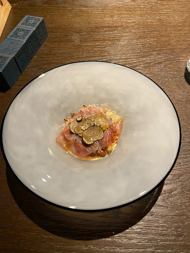 第三道菜白豆及牛肝菌做底,中層是西班牙火腿,而面層放上黑松露。這道菜味道還可以,因有黑松露及牛肝菌提香,但味道不很協調,不是我杯茶。👎🏻👎🏻