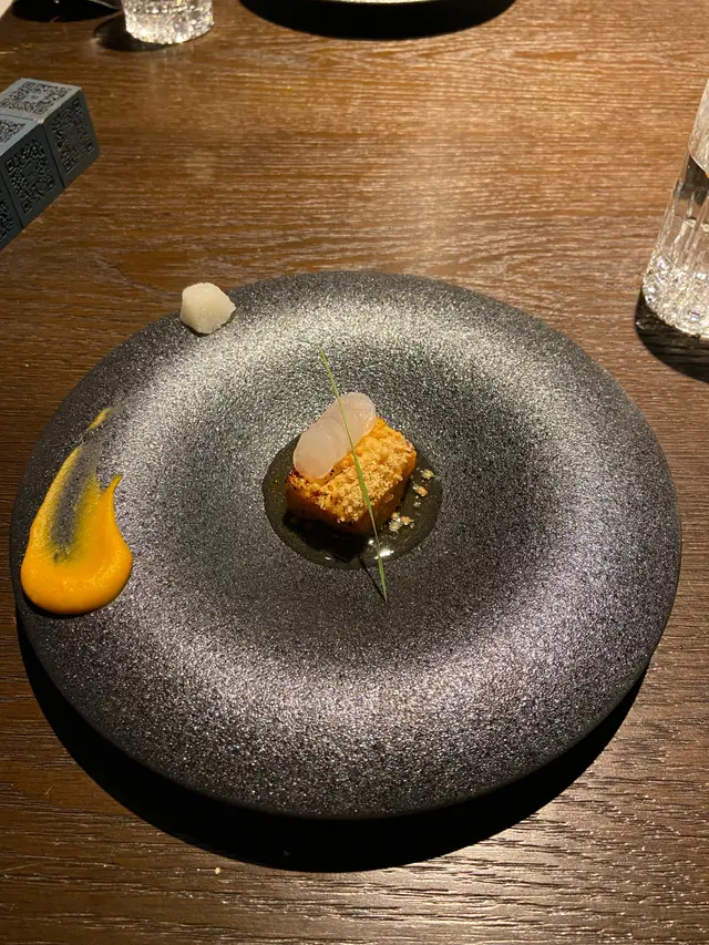 第一個前菜是用碗豆做底層,中層似豆腐,面是麝香提子汁做的啫哩,樣子十分之可愛。可惜味道只是清清淡淡的,並不特別吸引。👎🏻