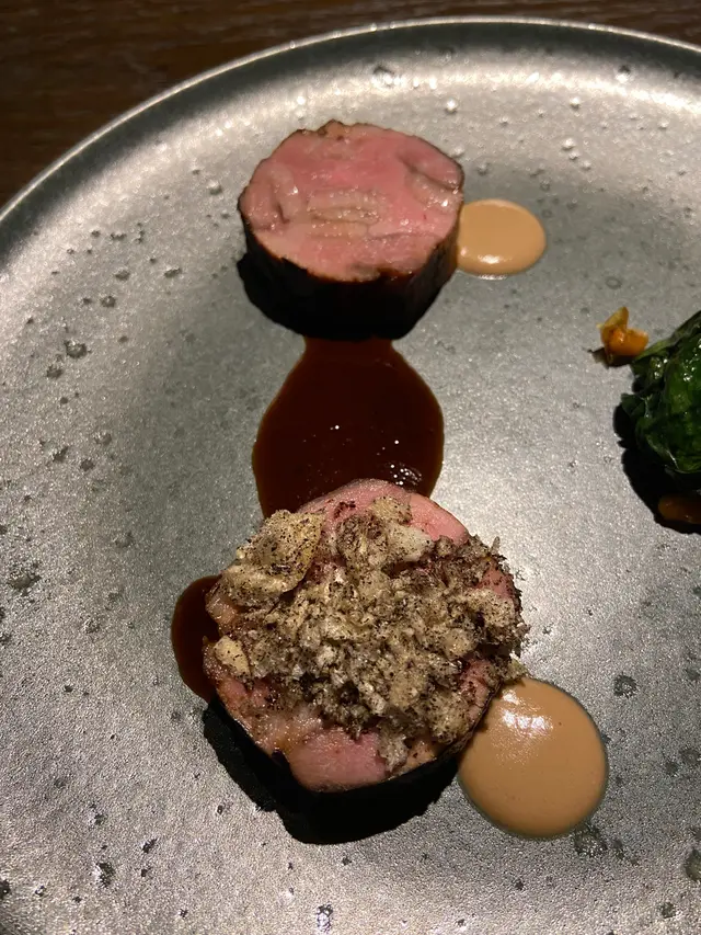 第五道菜是主菜,有黑毛豬 ,旁邊是蒜苗,醬汁是以味噌做成,還有黑松露醬。肉質嫩滑,濃濃豬肉香味。