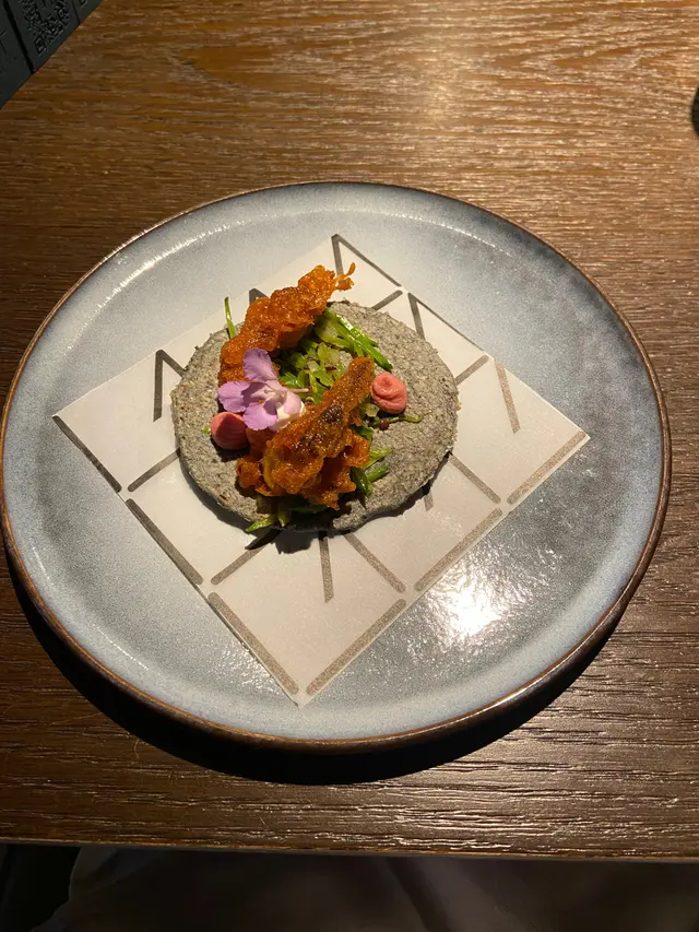 第二道菜樣子十分之吸睛,放在一張紙上,增加碟面的圖案。底層是用碗豆磨成蓉然後炸成脆片,香香脆脆,上面是軟殻蟹,放上食用花,靚。食落香口,軟殻蟹味道濃旭,好味。😋😋😋