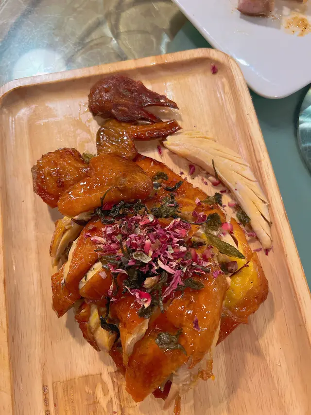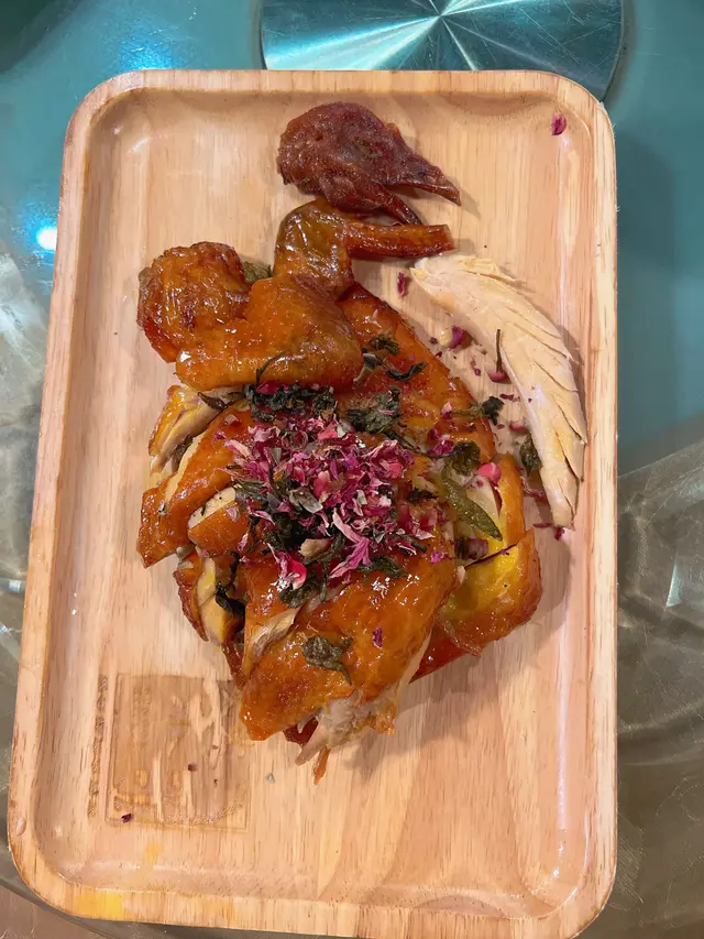 另外佢嘅招牌茶燻雞 花茶灑喺雞表面