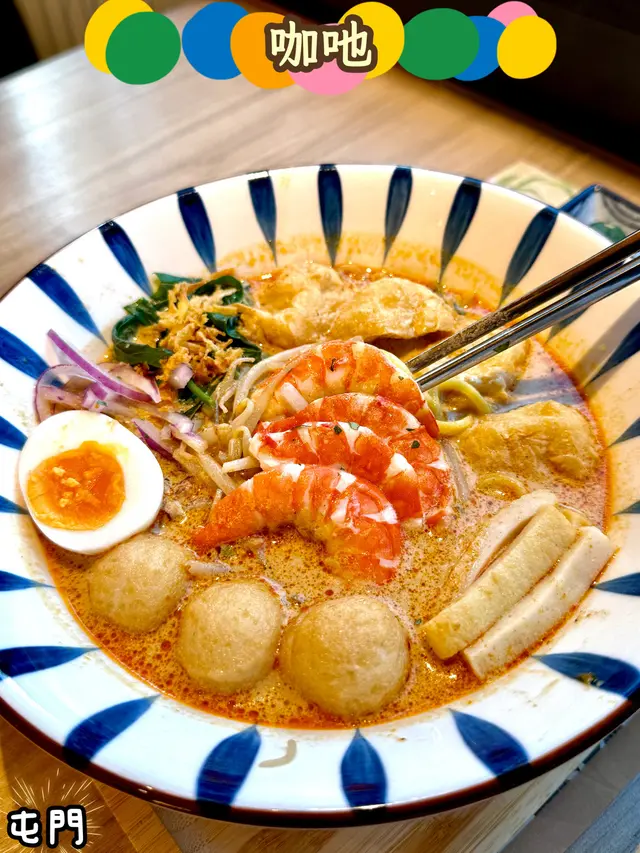 配料有蝦、魚蛋、魚片、豆卜、熟蛋、芽菜,湯底唔辣而偏椰奶香味,質地輕身,入口唔覺膩濟