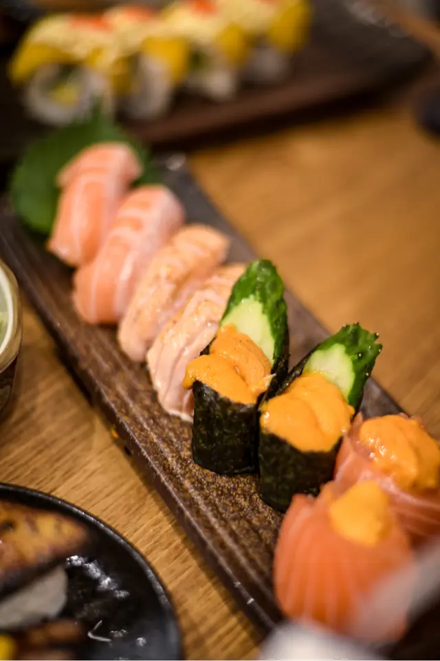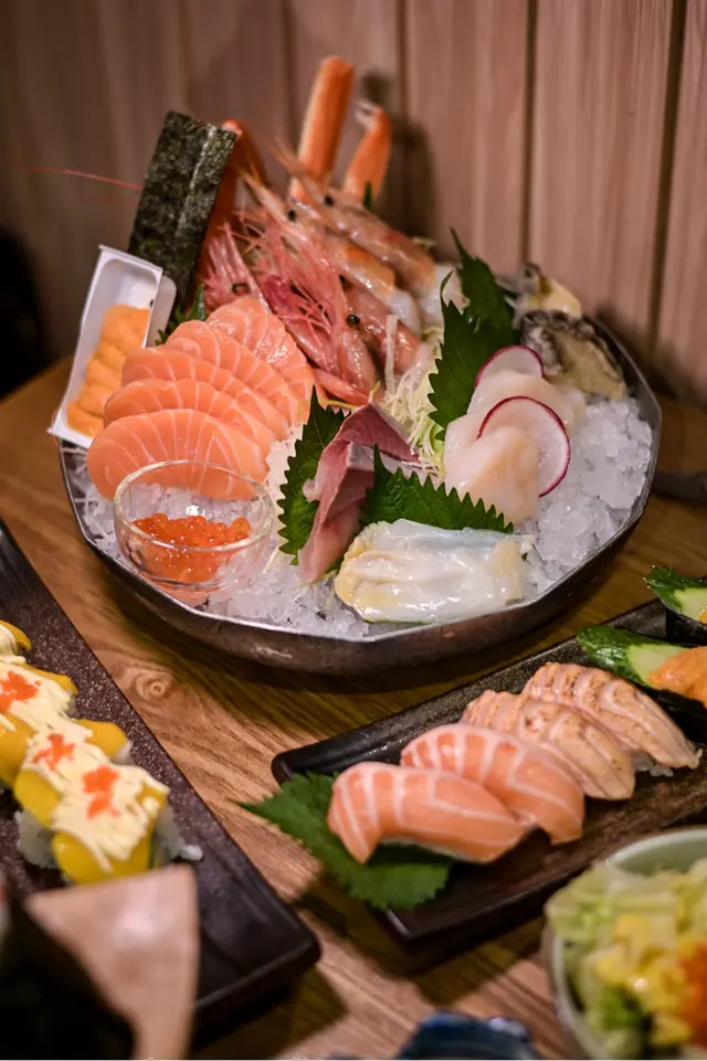 刺身、鮑魚、長腳蟹、壽司、卷物、爐端燒、炒飯、冷麵 、沙律、小食、炸物等,