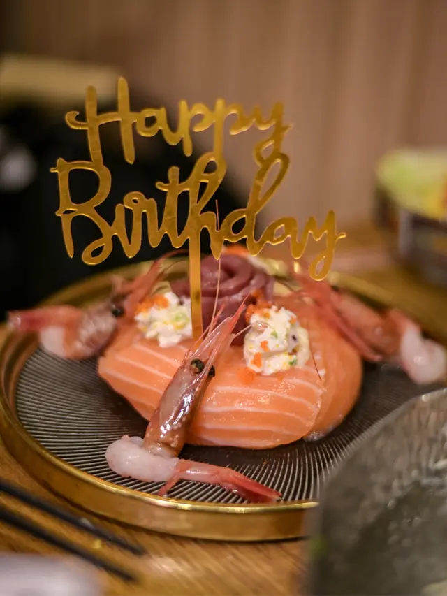 同朋友慶生更可以食盡佢! 生日優惠送的迷你壽司蛋糕有佢最愛的三文魚及甜蝦,