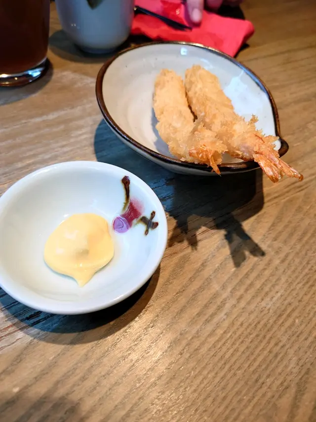 服務員不足,眼見得三人,喺門口等左個幾字先有人帶位,環境算闊落,lunch餐牌套餐選擇ok多,屋企人叫左雙色鰻魚丼定食,炙牛拉麵跟吉列蝦,我就叫左海鹽燒赤魚定食,另外散叫左料理長精選一串明太子燒翠玉瓜,首先炙牛拉麵,牛肉算冧,麵太少,只有兩啖,老人家都話唔飽