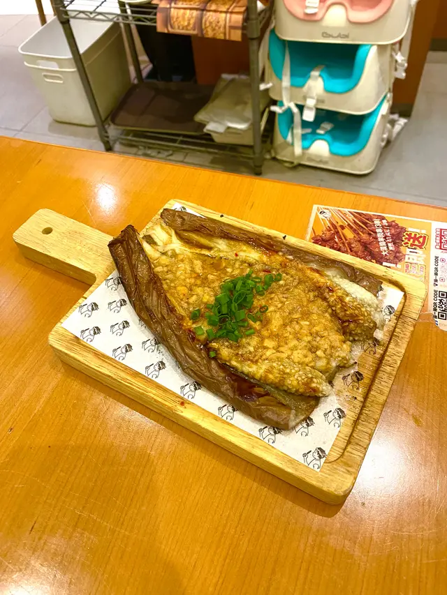 茄子放平攤在木碟上,上面有厚厚的蒜蓉及辣椒🌶️等,十分惹味之餘,又唔會太油膩。