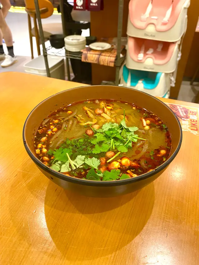 酸辣粉分量充足,紅油蓋住了整個粉,食落好過隱。配料有花生芫茜及醃製菜,湯底好濃郁,薯粉十分掛汁。