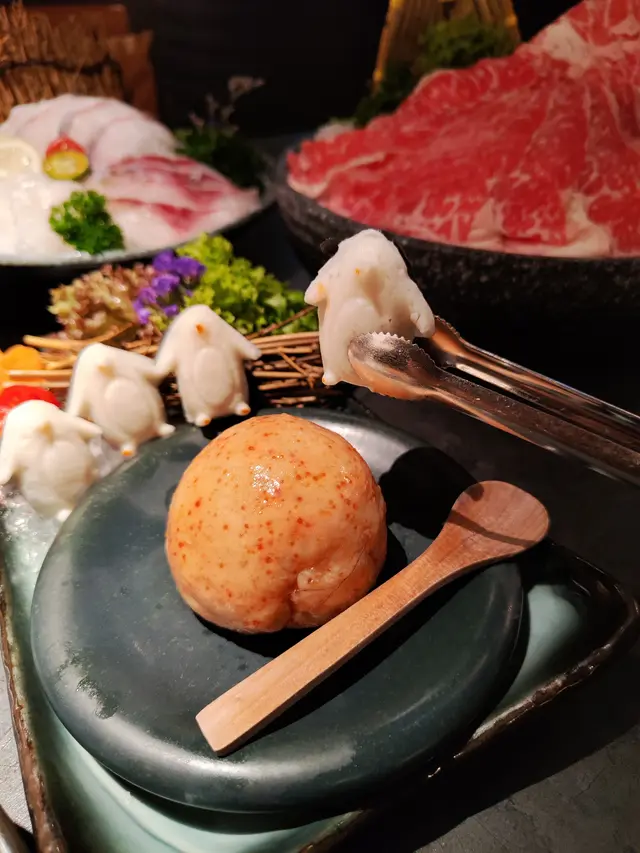 墨魚丸製作成造型趣緻的黑白企鵝丸,墨魚粒粒,口感彈牙;蝦滑混合飛魚籽,搓成大圓球般的月亮造型,創意十足。
