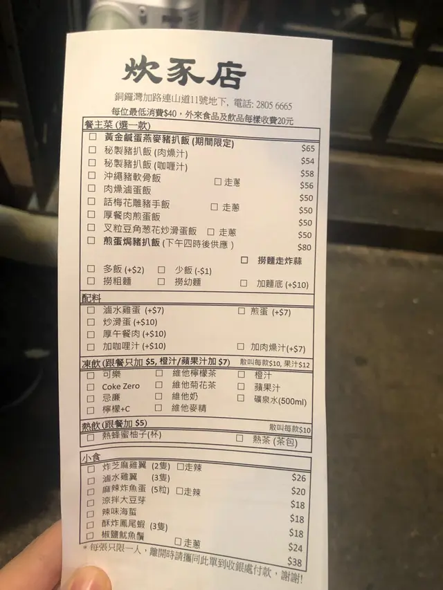 餐廳每位最低消費$40,有炸豬排、肉燥飯等選擇,可配白飯或麵,此外還有小食如雞翼、魚蛋、豆芽等。