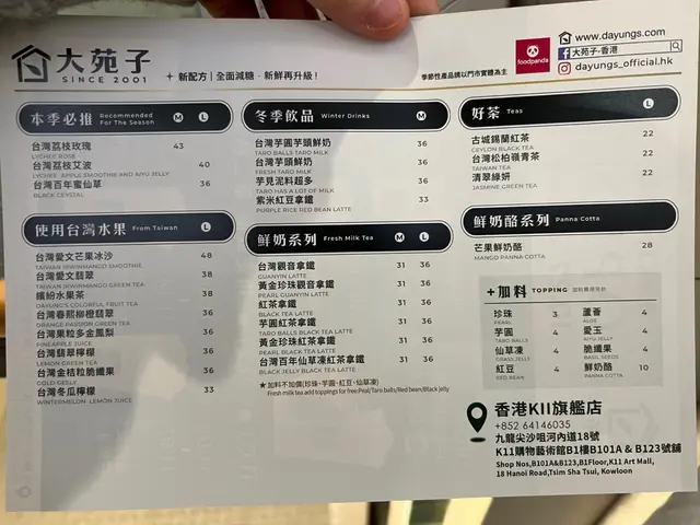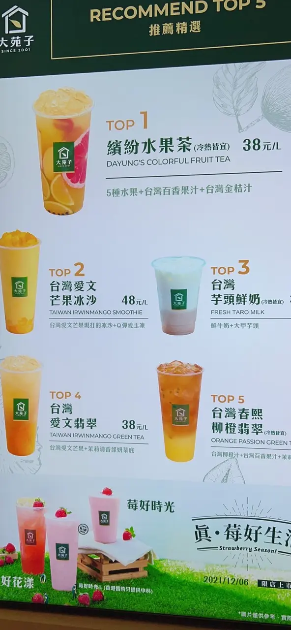 台灣人氣過江龍鮮果茶 lcman1210等级42022-02-1459 浏览 关注 前排經過K11 Art Mall,發現開左間新既主打鮮果茶飲店!原來呢個鮮果茶飲店係台灣已經開左20年,亦曾譽為台灣第一水果茶,咁就梗係要買黎試下啦😋😋🔹台灣愛文翡翠 $38 (3分糖少冰)Top 4入面都比左好多芒果肉粒👍🏻茶底好清新,芒果肉係甜既,飲既時候好清爽!!台灣愛文翡翠🔹台灣燒仙草 $36 (只有熱)我以為係碗裝,點知係杯裝🤣有提供一包仔碧根果仁碎,食既時候倒落去!入面材料好多,食極都有,燒仙草唔會過甜👍🏻👍🏻台灣百年燒仙草台灣百年燒仙草以上食记乃用户个人意见 , 并不代表OpenRice之观点。赞好分享台灣人氣過江龍鮮果茶 大苑子 (K11購物藝術館) https://s.openrice.com/QrLT0AVv100检举 张贴 评分5味道4环境4服务5卫生4抵食用餐途径外卖自取