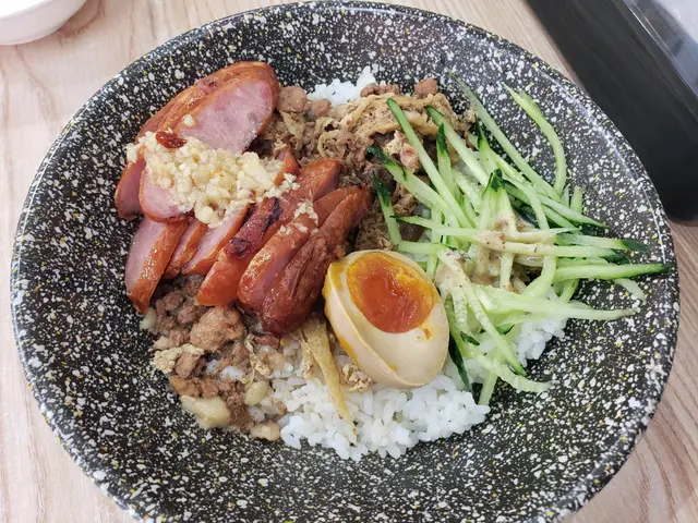 魯肉飯醬汁濃郁,是小妹大愛,肉質鮮嫩,搭配台灣香腸的微甜,非常下飯。還有半顆糖心蛋呢,青瓜絲的清脆口感也為整道菜增添了一絲清新。