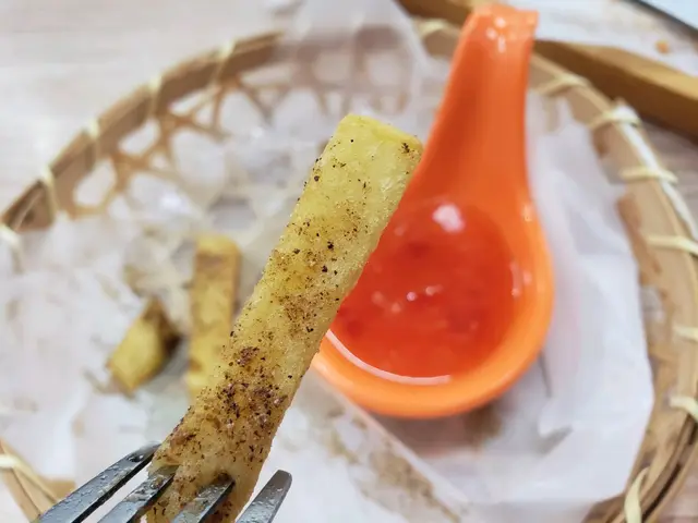 薯條金黃酥脆,外面灑上椒鹽粉調味,內裡鬆軟,搭配自製的醬料更是美味。一上枱便一掃而空了。