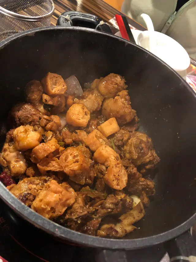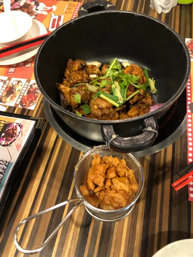 首先上場嘅係雞煲侍應教我們每兩、三分鐘返一次,便可吃到香、麻、辣的雞件了。這裏用的醬汁比較少,比較乾身,不過沒有影響雞肉的味道。等待雞煲再炒幾次之後,便加入油炸鬼,油炸鬼會吸收煲內的油,是這裏的特色。