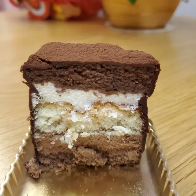 Nagasaki Chocolate Cake ($58) 在三件甜點中,賣相最靚,也最接近法式甜點工序繁複的要求;不過,仍然未算非常精緻。表面用一層半凝固的朱古力漿包裹,頂端灑滿可可粉;切開後,見到方塊共有5層:底層是朱古力海綿蛋糕,然後是朱古力 mousse、海綿蛋糕、鮮忌廉,頂層又係朱古力海綿蛋糕。同 French Chocolate Cake 一樣,朱古力味唔夠濃郁,尤其朱古力 mousse 的甜度較可可味更明顯。