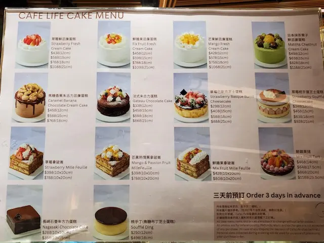 看看價錢牌,以朱古力、忌廉、芝士等等材料製作的傳統法式甜點價錢合理,與其他同級餅店差不多。至於餅店最出名的甜點,就用上了日本進口水果作食材⋯⋯ 嘩!好貴呀!比起香港其他名牌法式餅店還要貴,直逼香港最頂尖五星級酒店的餅店!