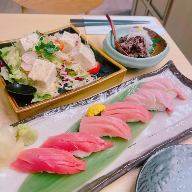 者係三款不同部位吞拿魚壽司包括有赤身、中拖羅、大拖羅各二貫