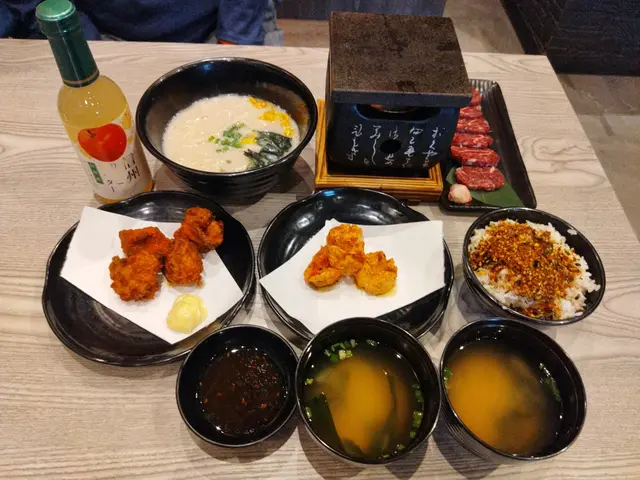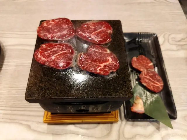 6片封門柳,白飯,小食八爪魚丸, 飲品加錢要了信州蘋果汁. 職員送上火爐一個, 上面係石板, 將牛柳放在石板上燒, 炻石燒是也