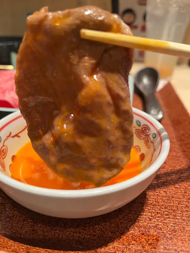 我見poster介紹呢種係「日本和牛黃金1%稀有肉」,每日限量18份。上碟時霜降紋理細緻平均,顏色較粉紅,滿滿嘅雪花,入口食到肉本身的柔軟及少少爽口,燒好放入蘭王蛋漿一齊食,口感層次分明。