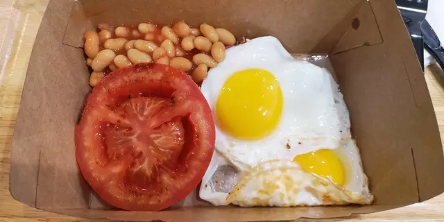 不過呢度啲嘢食就麻麻地嘅,印象中食過佢個肉燥太蛋米同雞扒都係強差人意,今日掛住幅壁畫又想穩陣啲,腸仔蛋應該唔會輸喇掛,點知佢竟然仲有半隻肉茄喺度添,仲要係煎過架,實在令人太感動喇,穩健嘅腸仔蛋加埋肉茄同茄汁豆,又構成另一幅美麗嘅圖畫。