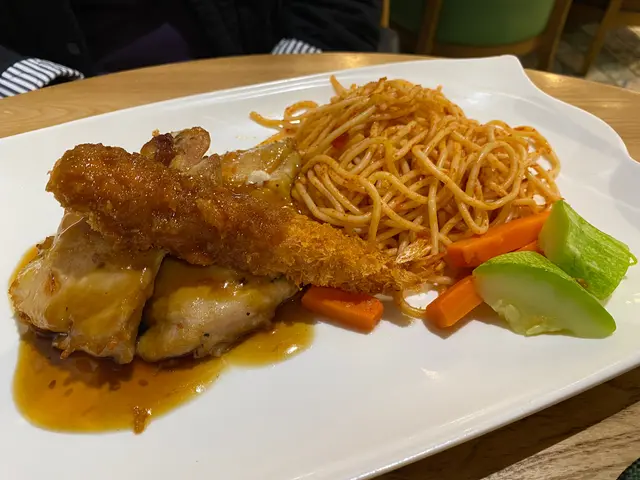 朋友點了雞扒炸蝦拼意粉(另可選飯或薯菜)