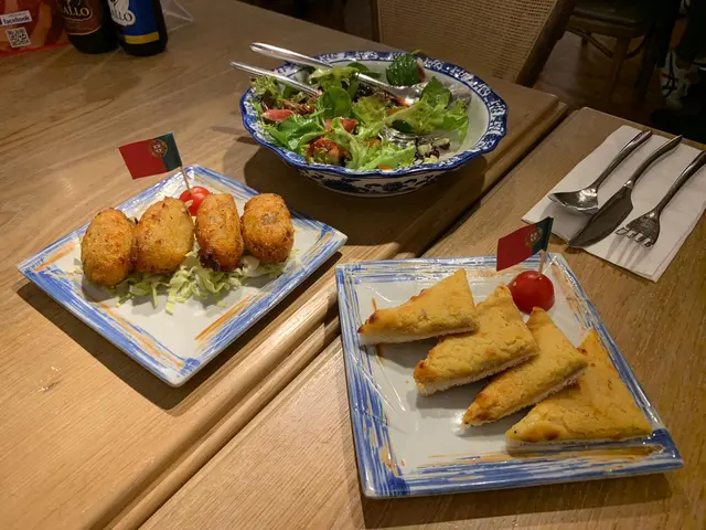 里斯本沙律份量足夠四個人分。蔬菜配風乾火腿片、咸芝士粒、橄欖粒,加上沙律醋,清新開胃。