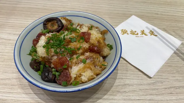 我叫了糯米飯、煎腸粉和豬骨粥。首先是糯米飯,強記美食的糯米飯非常有嚼勁,米粒口感滑嫩,而且味道十分濃郁。糯米飯的配料是臘肉、臘腸和蝦米,這些材料都非常鮮美,令整道菜更加美味。