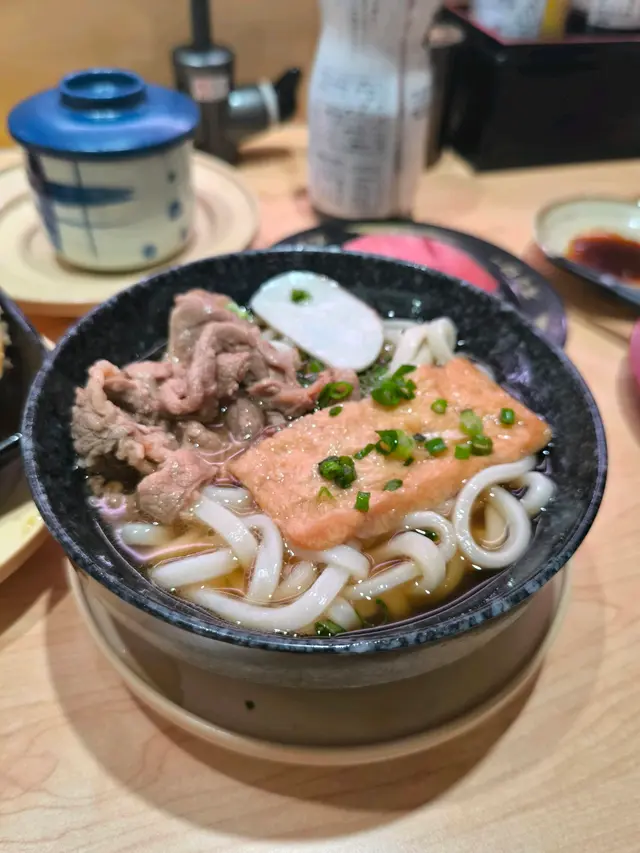 牛肉烏冬~如果淨食壽司怕唔夠飽可以選擇牛肉烏冬,雖然牛肉份量只有2-3片,還有一塊腐皮.細細碗剛剛好.