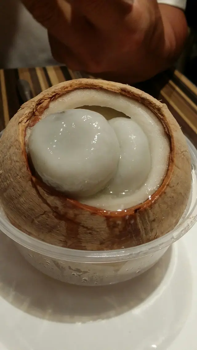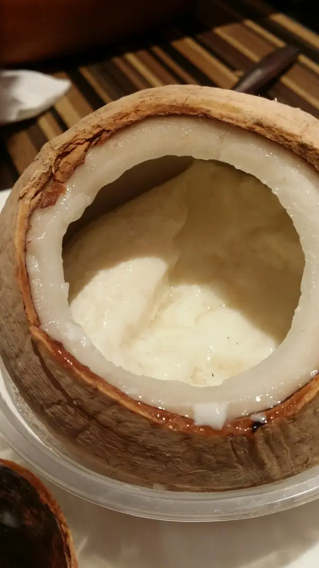 上枱已經見到椰皇肉變左淺紫色(新鲜椰皇,係雪白色肉)