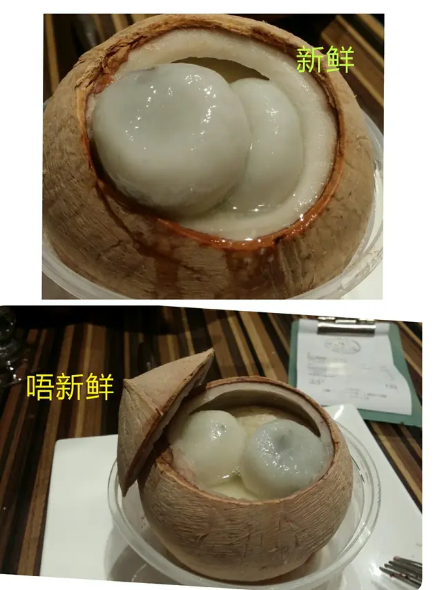 同店員反映……答案(今日先造),我們強調有酸味,答案(椰皇無問题),我們當然知道椰皇(無變壞,只係唔新鲜的酸),店員呆企,我們叫廚房甜品師,出來試味,無人出來試味,店員再過來的時候,有一個全新椰皇上枱,椰皇肉雪白,蛋白面無一層椰水,蛋白好幼滑,湯圓熱辣辣,味道新鲜