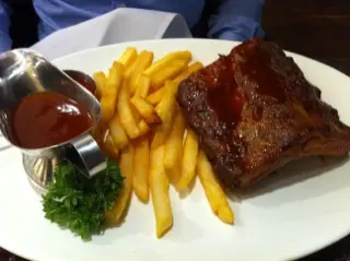 但講番野食, 我唔覺得差....首先我地點半打蠔...好新鮮,好好味。再黎我既hamburger,塊肉冇話好似有食客咁講frozen左,反而好juicy,似係餐廳水準之作,當然也不便宜,但總算物有所值。rib 都好好味。但份量比較少,這個是不抵食。