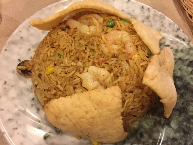 今朝既話題後,唔難去諗中午Lunch 食啲咩。。😝 去到沙巴,明顯無平時咁多人,等左都無1min 就有位,Luncky~~ 睇下餐牌食咩先,喇沙狂熱既同事依然不離不棄咁食喇沙,另外位同事就試下海南雞,而我就揀左海鮮炒飯。因為有蝦片🍤🍤🍤 Yeah!!