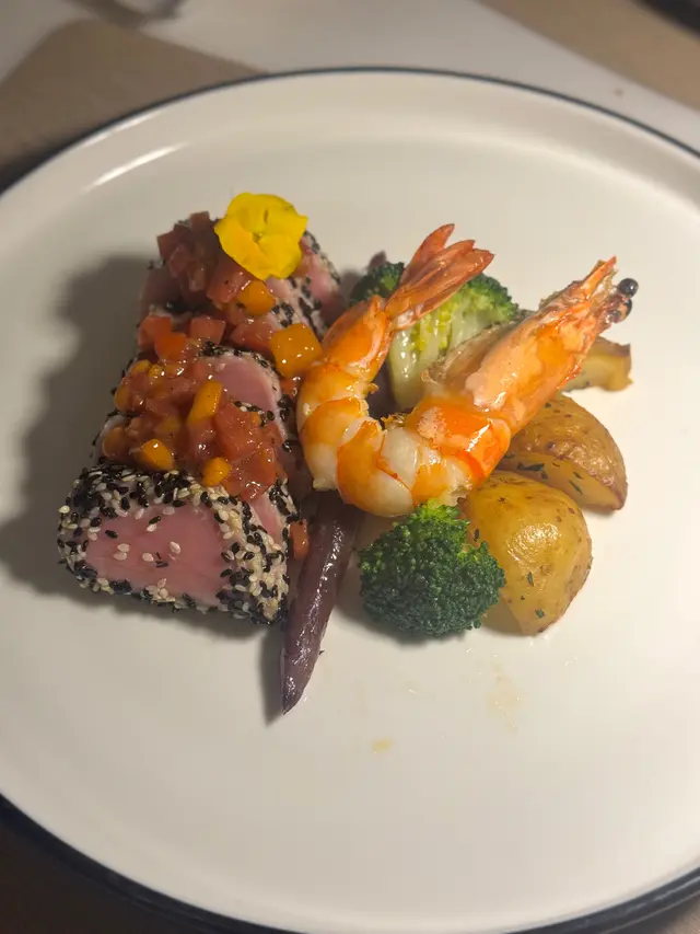 Seared Tuna with Sesame and Pan-roasted King Prawn