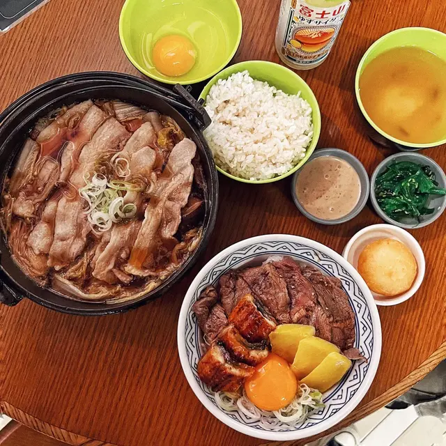 另外見到佐敦店限定嘅壽喜燒,一大煲豚肉,仲有6款野菜配料(娃娃菜、洋蔥、大蔥、香菇、金針菇、紅蘿蔔,十分足料呀😋湯底甜甜地,套餐仲有隻生蛋,可以放埋入煲做半熟蛋添,2個人share都可以呀🍲