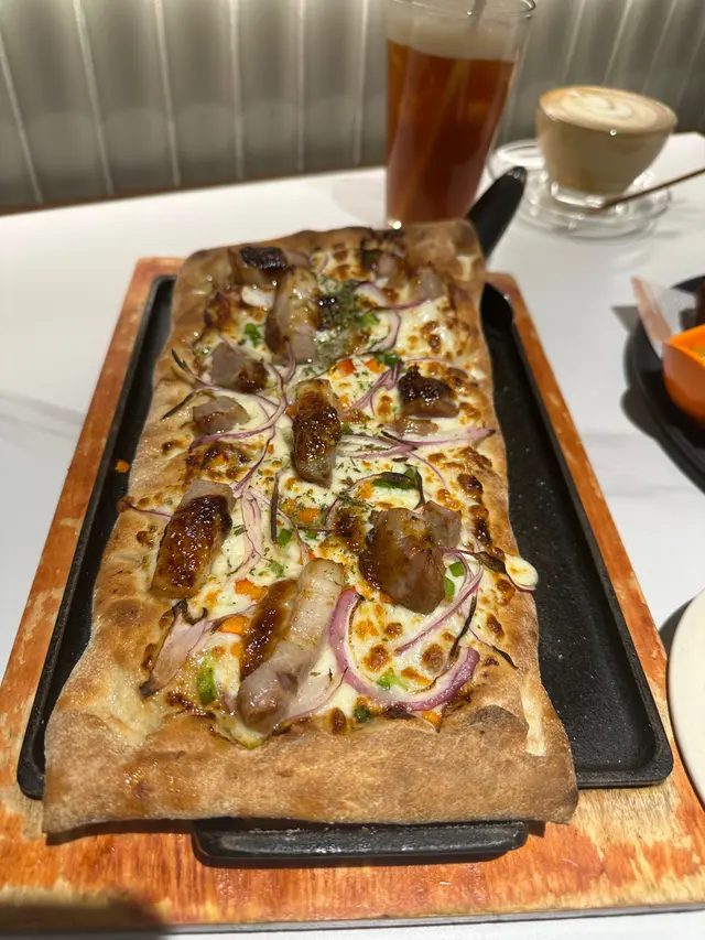 韓風甜麵醬煙豬腩肉pizza有炭燒嘅香味,麵皮幾軟熟,豬腩肉肥瘦相隔,肉質爽口,味道也很入味。