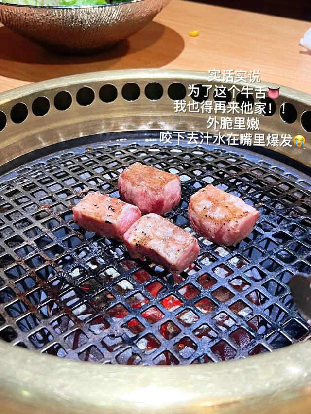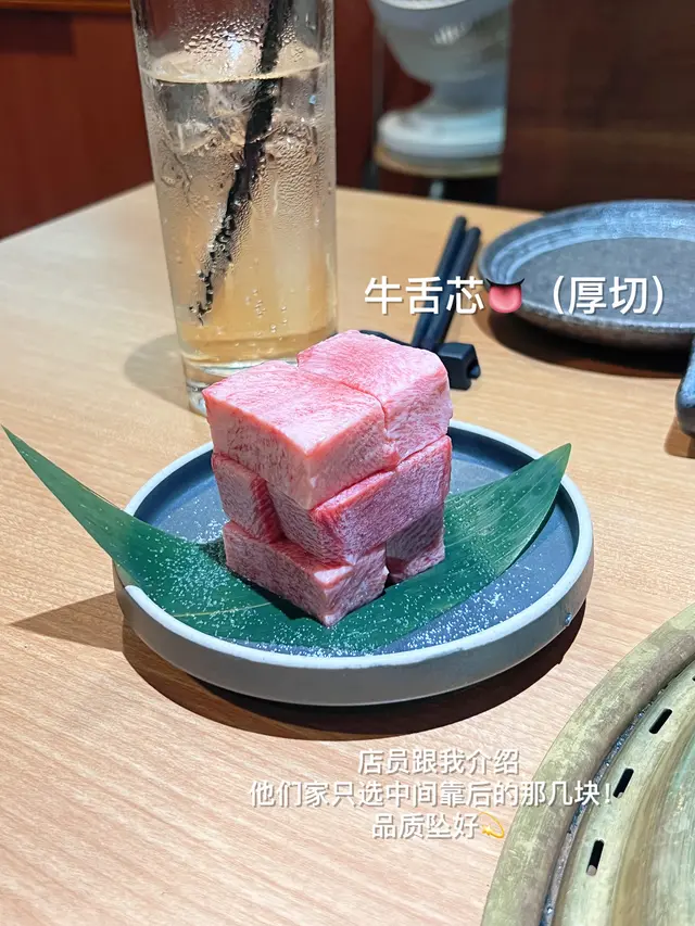 厚切牛舌芯👅,据说是只保留了中后段,烤完是外脆里嫩的,咬下去就有丰富的汁水~没吃过牛舌芯的朋友可以尝尝!