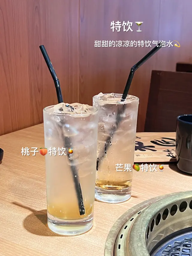 特饮🍸我们点了气泡水桃子🍑特饮和芒果🥭特饮,记得要搅匀~不然糖浆都堆在下面会很齁~