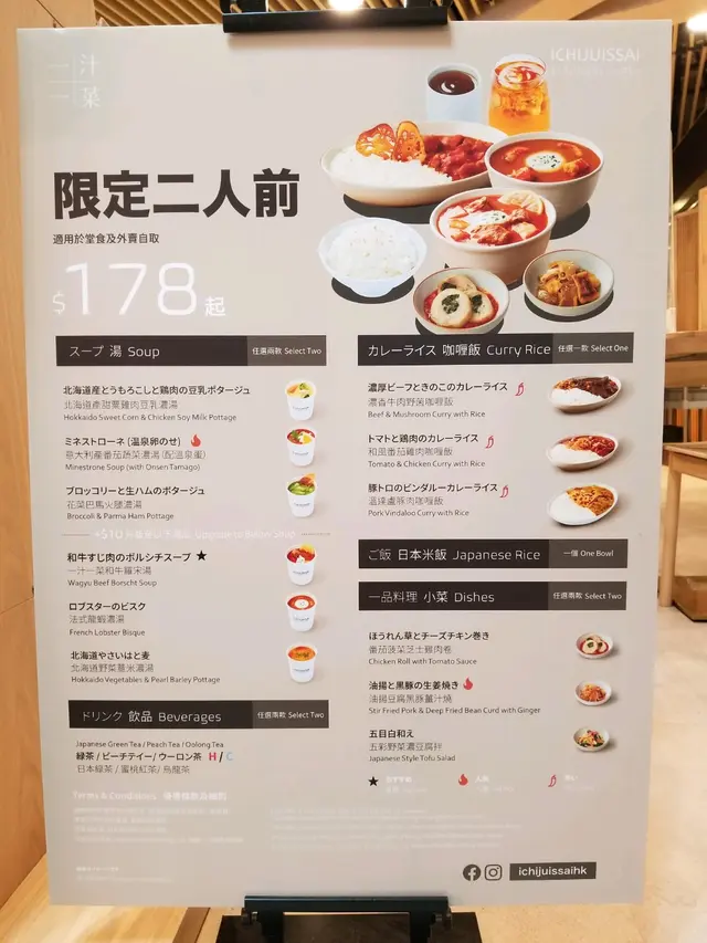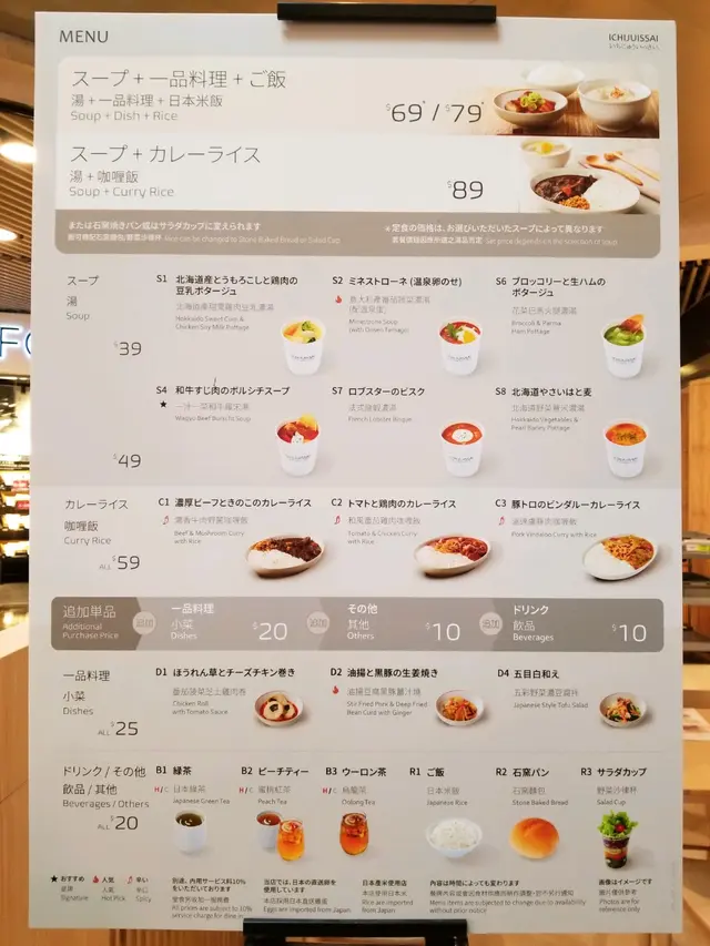 一汁一菜和牛羅宋湯為皇牌湯品, 湯料豐富, 份量不少。有有嚼勁的牛肉, 爽口的紅蘿蔔, 雖腍但有咬口的薯仔, 香甜的洋蔥和較少在羅宋湯見到的檸檬, 整體味道濃郁, 酸甜偏微酸, 吃完已飽1/3 。難得的是上菜時入口是熱的, 很暖身。
