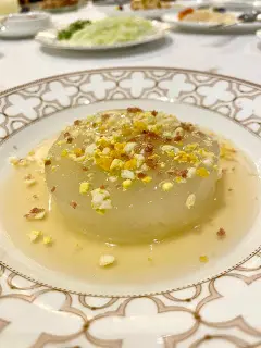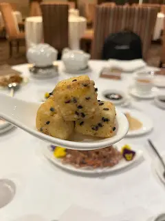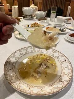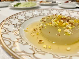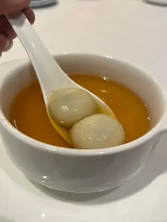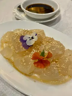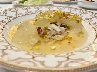 典型粵式手功菜。師傅先將原塊冬瓜起肉,再將切成幼粒的鮮蝦、金華火腿、鹹蛋黃,釀在冬瓜肉中先蒸熟,恍如一件白玉,之後再扣上上湯芡: