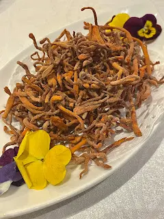 椒鹽蟲草花」用上近年常見的蟲草花入鐉,它性質平和,不寒不燥,也可提高免疫力。除了用來煲湯,今次用椒鹽乾炸脆卜卜,是另一種美態,邊吃邊進補,感覺過癮: