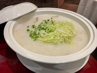 吃前加入生菜絲及蔥粒增香,粥相當甜,帶絲絲陳皮獨有的香;鮑魚肌肉仍保持彈性,輕點豉油吃提味,更能品嚐其鮮: