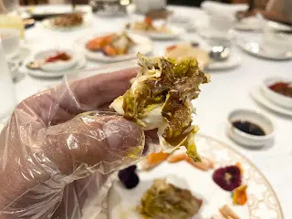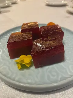 套餐頭盤有四項,「百花釀秋葵 · 金磚豆腐 · 蔥油海蜇頭 · 椒鹽蟲草花